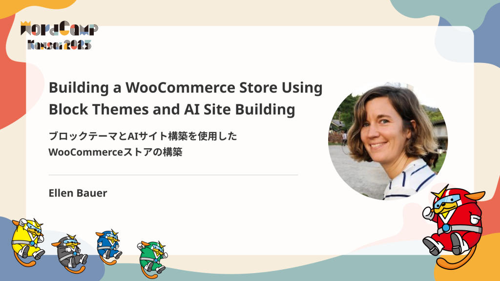 セッションの最後には、ブロックテーマの柔軟性とAIのパワーを組み合わせることで、WooCommerceストアのデザインワークフローを最初から最後まで効率化できることを理解していただけるでしょう。