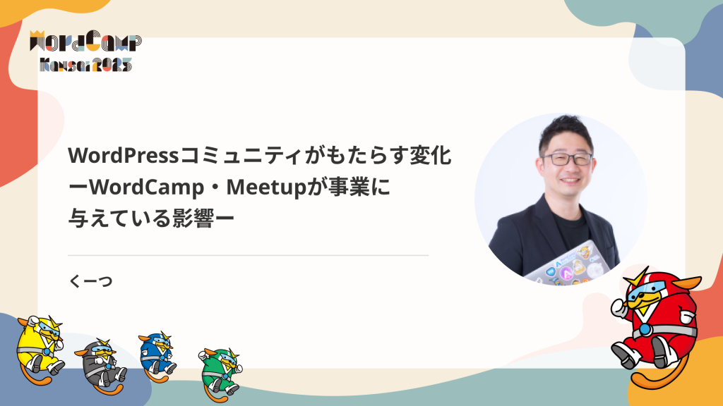 WordCampやMeetupで得た知見や人との出会いが、日々の制作フローや自社サービスの方向性にどう影響を与えたのか。参加から今日まで、自分自身と自社の事業がどのように変わり、どんな思いでコミュニティに関わり、今後どう貢献していきたいかをお話しします。【内容】
